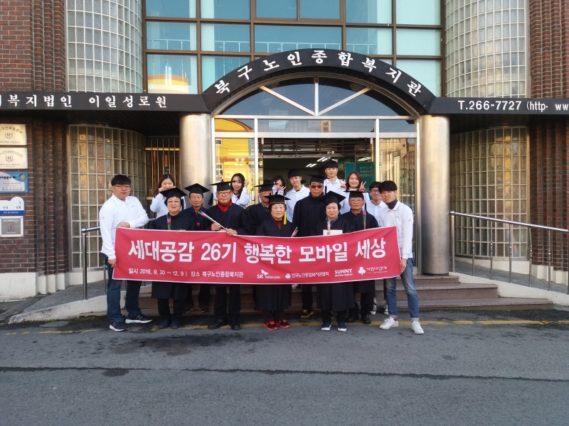 세상행복한 모바일세상 스마트폰 활용교육 26기 2차 경진대회&졸업식을 12월 9일(금)에 진행이 되었습니다. 그동안 배운 수업에 대한 점검의 시간으로 문자 및 정보 경진대회를 실시하여 소정의 상품을 전달하고 지금까지 꾸준히 교육에 참석해주신 어르신들을 대상으로 졸업식 및 수료식을 진행하였습니다. 졸업식 가운을 직접입고 진행함으로 어르신들도 감회가 새롭다고 좋아하셨고 친손자처럼 친해진 써니와 헤어지는 아쉬움도 컸지만 행복한 수료식이였고 수료증까지 받으니 의미가 있었습니다. 그동안 휴대폰 활용 교육을 통해 어르신들에게 기본적인 스마트폰 기능과 다양한 어플 활용법을 가르쳐 드림으로써 1-3세대간 소통과 친밀감이 형성되었습니다.