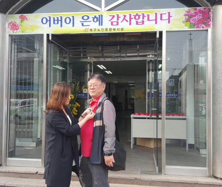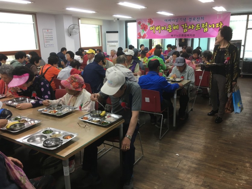 2017년 5월 8일 어버이날을 맞이하여 북구노인종합복지관에서는 예쁜 카네이션을 준비하여 어르신 한분 한분에게 정성스럽게 달아 드리는 시간을 가졌습니다.