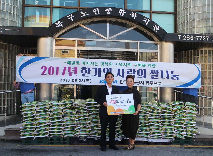 9월 28일(목), 한가위를 맞아 소외된 독거어르신들을 위해 사용해 달라며 코레일광주본부에서 쌀 10kg 140포대를 후원해 주셨답니다.