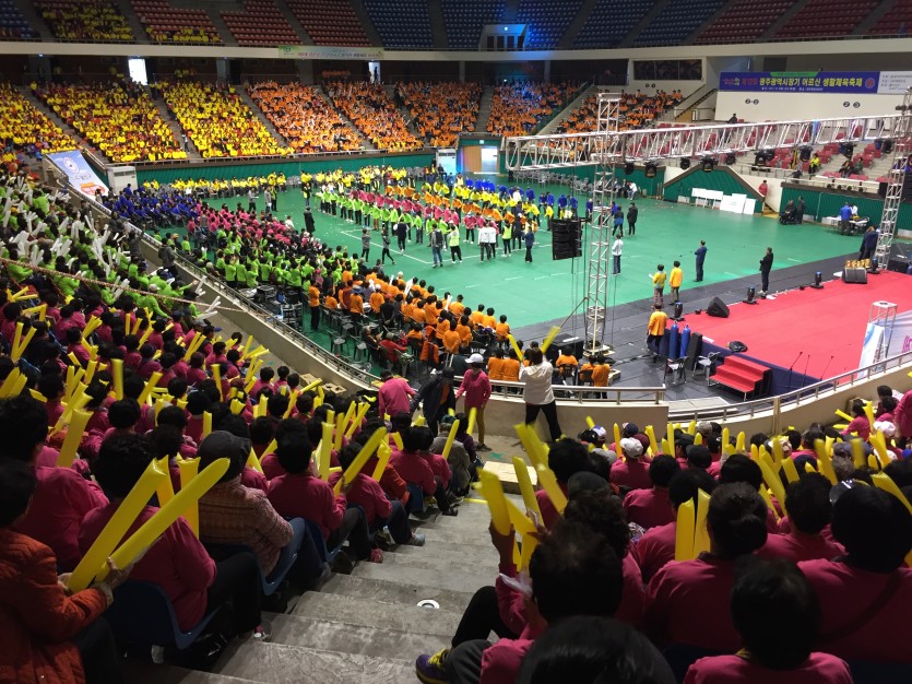 11월 7일(화) 제12회 광주광역시장기 생활체육축제를 개최하였습니다. 염주체육관에서 광주지역에서 거주하는 60세 이상 어르신 5000명이 참석하였습니다. 어르신들의 화합을 도모하고 체력을 향상시켜 활기찬 노후 생활을 이어나갈 수 있도록 마련한 축제의 장이였습니다.