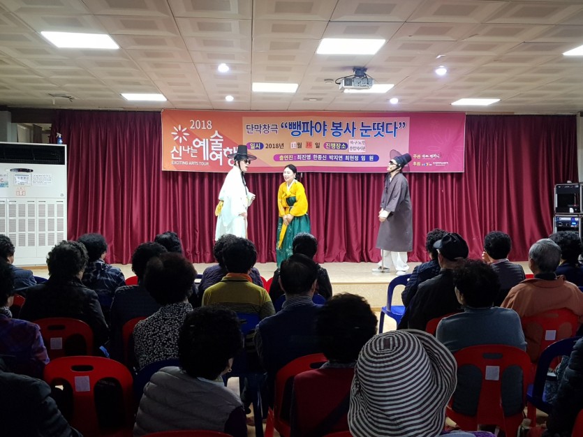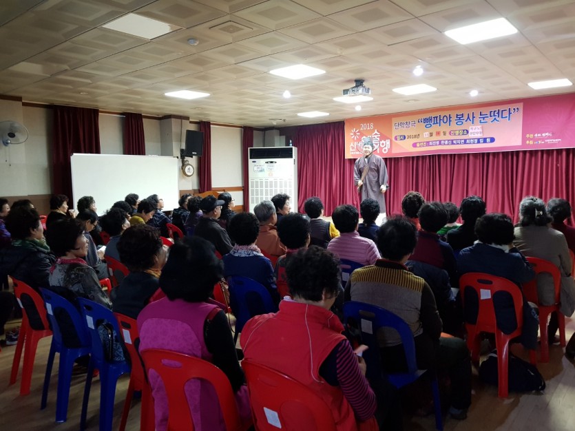 11월 16일(금), 지역사회 연계사업 일환으로 아트컴퍼니와 연계하여 복지관 이용 어르신을 대상으로 본 기관 4층 강당에서 단막 창극'뺑파야, 봉사 눈떳다' 를 실시하였습니다.