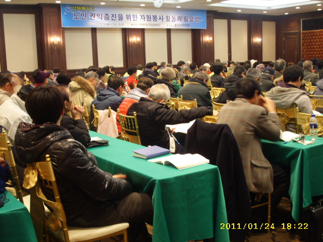 지난 2011년 1월 24일과 25일, 1박 2일로 경기도 이천에서 노인 자원봉사 리더 양성 교육이 있었다. 전국 노인 자원봉사 리더들의 모임에 본 복지관 인솔 하에 광주광역시 각 구 노인복지관 자원봉사 리더 어르신 20분이 교육에 참여 하였다. 갑자기 내린 폭설로 못 오신 분도 몇 분 계셨지만 무사히 마치고 돌아올 수 있었다. 각 지역별 자원봉사 계획을 어르신들이 직접 설계 해 보고 실천 일정을 잡아 보는 등 노인 자원봉사의 구체적 윤곽을 잡을 수 있는 뜻 깊은 자리였다.