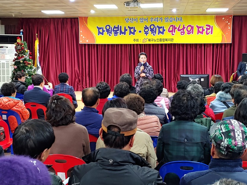 11월 30일(금), 한 해 동안 북구노인종합복지관을 후원해주시고 봉사해주신 자원봉사자·후원자 100여명을 모시고 만남의 자리 행사를 진행하였습니다. 복지관에 경제적·정서적인 지원을 줌으로써 실질적인 복지향상에 기여해주시신 분들께 자원봉사자·후원자 만남의 자리를 통해 격려와 노고를 치하하는 시간이 되었답니다. 항상 본 복지관을 위해 사랑과 봉사의 정신으로 마음을 나누어 주시는 모든 분들께 진심으로 감사드립니다♡