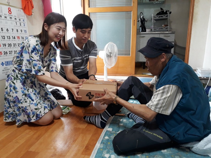 2019년 8월 23일(금) 25기청년간부회(토지정보과)에서 "인견이불 및 쿨매트" 후원으로 홀로 사시는 어르신들에게 지원하였다. 25기청년간부회에서 어르신댁에 함께 방문하여 물품을 드리고 이야기를 나누며 뜻 깊은 시간을 보냈고 지원받으신 어르신들 모두 기뻐하셨다. 인견이불, 쿨매트 각 40개씩 80명의 어르신들에게 배분되었고 더운 여름철 시원하게 보낼 수 있을 거 같다고 행복해하셨고 감사함을 전하셨다. 후원해주신 25기청년간부회분들께 진심으로 감사함을 전합니다~~^^