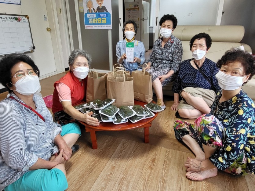 코로나19로 인하여 경로당 내 식사가 어려워 가정 내에서 드실 수 있도록 개별포장 된 모시송편 팩과