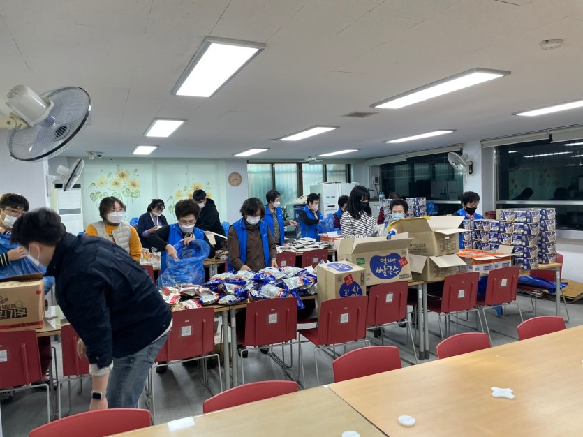 (사랑의식당 미운영으로 수급자 및 차상위 어르신들께 전달할 대체식품 포장 활동 진행)
