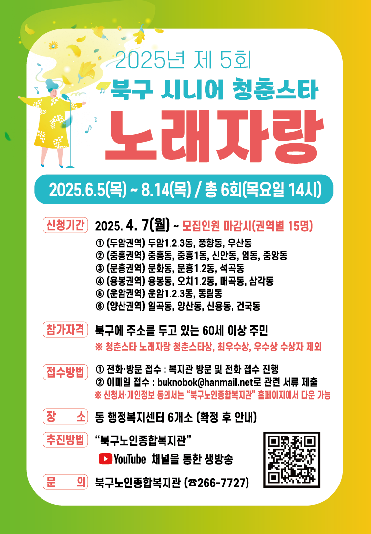 2025년 제 5회 북구 시니어 청춘스타 노래자랑 참여자를 모집합니다.